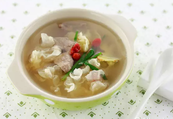做法:1、猪肝洗干净,放入清水中浸泡半个钟头,期间换2-3次水,然后切成片。2、银耳泡发后,洗干净,去掉蒂头,掰成小朵。3、锅中加入清水煮开后,放入银耳、猪肝、枸杞、葱段、姜片一起烹煮。4、等到猪肝熟透后,加盐调味即可。