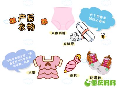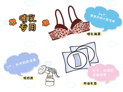 【衣物类】哺乳内衣:前扣式的哺乳式文胸方便喂奶,2至3个即可;产妇睡衣:可以是平时穿的宽松的长袖睡衣,多准备几套,产后容易出虚汗,尤其是夏天生育宝宝的妈妈,一天就需要好几套来换洗;羊脂膏和防溢乳垫:羊脂膏治疗乳房皲裂,乳垫保持乳房干爽、清洁;内裤:刚生完宝宝恶露比较多,建议用一次性内裤比较方便干净,不用麻烦别人去清洗,用后就可以扔掉了;束腹带:有利于产后恢复,帮助收缩腹部,防止胃下垂;拖鞋:便于分娩后下床行走,也方便洗浴时使用,1双即可;袜子:袜子准备全棉的就好,夏天也要穿好,以免日后落下月子病。