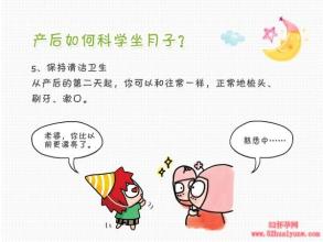 漱口刷牙:产妇“坐月子”期间,进食次数较多,吃的东西也较多,如不注意漱口刷牙,容易使口腔内细菌繁殖,发生口腔疾病。过去,有不少妇女盲目信奉“老规矩”——坐月子里不能刷牙,结果“坐”一次“月子”毁了一口牙。产妇每天应刷牙一两次,可选用软毛牙刷轻柔地刷动。每次吃过东西后,应当用温开水漱漱口。只要体力允许产后第2天就应该开始刷牙,最好不超过3天。 一般产后一周可以洗澡、洗头:但必须仅持擦浴,不能洗盆浴,以免洗澡用过的脏水灌入生殖道而引起感染。6周后可以洗淋浴。 居室内经常通风,室内温度不可太高,也不可忽高忽低。过去常有将门窗紧闭,不论何时产妇都要盖厚被的说法,这是十分危险的,尤其是在夏季,极易造成产妇中暑。但要注意以下几点:①坐月子期间要避免身体直接吹到电扇的风。②开冷气时不要将风口对着产妇,并将室温设定在摄氏25~28度左右是最适宜的。③坐月子期间衣服若因排汗量过多而湿了,一定要马上换干的衣服;冬天时床边准备睡袍,半夜起来喂奶要立刻穿上,才不会受风寒。
